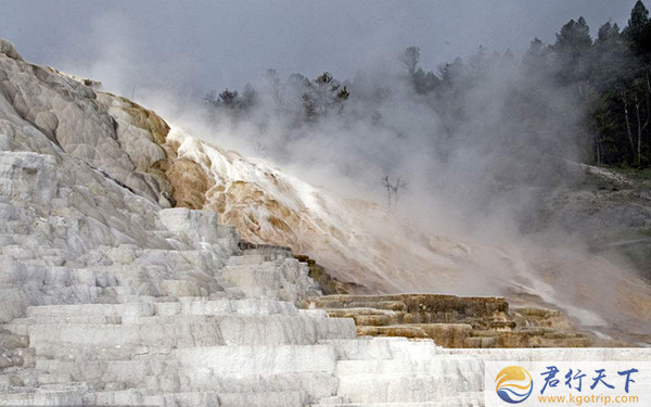 大猛犸热泉也被称为蛋糕温泉,是最活跃的,也是存在时间最久远的地热区。多个热泉从高处的泉眼涌出,冒着蒸汽从山坡上一节一节地向下流淌,在每一层的沉积池里沉积、转换、填满,伴随着各种各样的细菌被染得五颜六色。