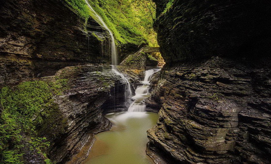 沃特金斯峡谷位于美国的纽约州五指湖地区,这里属于层积岩地质,受冰川和溪流的侵蚀,形成了奇特的地貌。沿着约两英里的峡谷小径共有十几挂瀑布。这里有优良的峡谷步道,可以近距离欣赏的瀑布,令人赏心悦目的自然风景,为游客提供了绝佳的拍照胜地,被誉为“千年幽谷”。